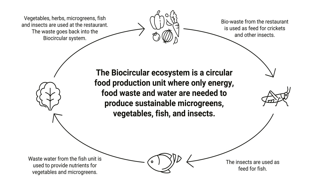 In the third container – the BioPod vegetable container from Nordicflexhouse – more than 40 types of herbs, microgreens, and edible flowers are grown year-round under LED lights, nourished by the recirculated fish water. The harvest is used in the restaurant – and in this way, the entire cycle is connected, enabling a complete circular food factory to operate on just 72 square meters.